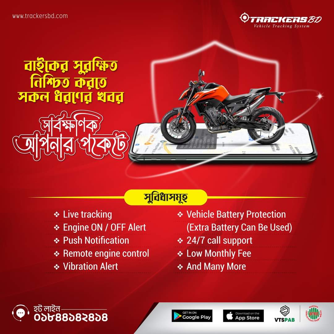 আপনার প্রিয় বাইকটি কি নিরাপদ? বাইকের সুরক্ষিত নিরাপত্তার জন্য ব্যবহার করুন TRACKERSBD GPS ট্র্যাকিং সার্ভিস । এখনই আপনার বাইকে ইনস্টল করুন TRACKERSBD Vehicle Tracking System এবং উপভোগ করুন একাধিক সুবিধা।